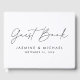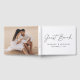 Livro de convidados simples e elegante, com um roteiro preto e manuscrito misturado com letras modernas, sobre um fundo branco. Personalize o livro de hóspedes do casamento minimalista com seus nomes e data do casamento. Adicione texto personalizado à coluna do livro convidado, como seus nomes, a data etc. A parte de trás do livro de hóspedes mostra a sua fotografia horizontal do noivado. O livro de hóspedes preto e branco é perfeito para casamentos modernos.