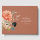 Um belo livro de convidados de casamento, com nomes de casais em marfim chico, contra um belo e rico fundo de terra ocre e uma bela mostra de flores florais de aquarela. A parte traseira inclui as iniciais do casal lado a lado. A design exprime um sentimento de alegria e elegância juvenil.