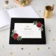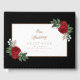 Lindas bordas florais de aquarela... com lindíssimos peões vermelhos, verde-luxuoso, eucalipto e hálito de bebê... rodeiam um retângulo com seus detalhes em um roteiro de tipografia dourada. Uma foto de casamento de sua escolha está no verso. Os ricos vermelhos e verdes nos florais partiram do elegante fundo preto, branco e dourado. Adicione sua própria foto e detalhes seguindo o link "Personalizar isso". Se você quiser assistência, por favor, não hesite em me contactar através de mensagem aqui no Zazzle ou email. susanmingaydesigns@gmail.com