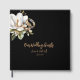 Linda Magnolia branca floresce e anéis de casamento dourados em fundo preto e texto dourado. Em texto elegante de cor dourada sobre fundo preto que corresponde ao conjunto de convites dos mesmos designs