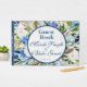 Blues e florais de aquarela pálidos criam um fundo para um círculo, enquadrado em azul profundo, para a frente deste livro convidado. "Guest Book" está em uma fonte sérvia nítida — em uma cor azul rica. Os nomes e a data estão em uma letra elegante, também em um azul profundo como o cobrir traseiro e a coluna vertebral. As flores no arranjo de fundo são acompanhadas por algumas penas para acrescentar textura e interesse.
