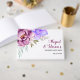 Flores púrpuras, azuis, cor d'água, foto floral do livro de hóspedes. Uma adorável design de casamento que inclui flores aquáticas em tons de roxo e azul e folhas. Os nomes estão na tipografia de scripts.