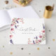 Um belo design floral, rosa e roxo, pode ser personalizado com seus nomes e data.