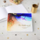 Esse design colorido apresenta uma única lavagem de tinta alcoólica em tons azuis de safira e laranja de citros. Livro de Convidados de Casamento Azul-Laranja Vibrante.