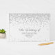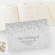 Um livro de convidados de casamento branco elegante com brilho de diamante prateado, personalizado com os nomes dos casais e a data do casamento.