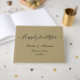 Felizmente Depois" Este Simples Ouro Tan do Livro de Convidados de Casamento é uma maneira elegante e moderna de capturar as memórias do seu dia especial. O livro de hóspedes é perfeitamente personalizável, permitindo-vos personalizar o cobrir com os nomes da noiva e do noivo e a data do casamento, fazer-o como uma manutenção significativa. A espinha do livro de hóspedes pode ser personalizada com os nomes dos casais e as datas de casamento numa fonte sutil e saborosa que melhora a elegância geral do livro. A bela inscrição em um ouro de um fundo cria um olhar elegante e eterno que complementa vários temas de casamento, sejam eles rústicos, modernos ou minimalistas. Na parte de trás do livro de convidados, você pode exibir sua foto favorita, seja um noivado incrível ou um momento memorável de seu tempo juntos. Este toque pessoal torna o livro de hóspedes ainda mais significativo, convidando seus hóspedes a escrever seus bons desejos e mensagens em um espaço lindo e personalizado. A design e o layout do livro de convidados criam uma impressão duradoura, oferecendo um lugar para coletar notas sentidas de seus entes queridos e, ao mesmo tempo, mostrar sua única história de amor.