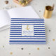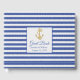 Livro de convidado de na moda de casamento feito em um tema náutico ou em faixas horizontais azuis e brancas. A frente do livro convidado tem uma área de texto quadrado branco, decorada com gráficos de âncora de um ouro. Personalize os campos de texto personalizados, para o dia do seu casamento.