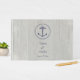 Este design apresenta uma cinza de fundo de madeira curada. O topo do cobrir tem uma âncora azul cercada por um padrão de corda. Áreas de modelo estão previstas para você adicionar os nomes da noiva e do noivo e a data do casamento.