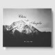 Casamento preto e branco debaixo das montanhas. Fotografia paisagística de uma montanha coberta de neve com escuridão abaixo e céu branco nublado acima. Os nomes do casal estão em caracteres pretos acima da montanha no céu e todos os detalhes estão em caracteres brancos abaixo da montanha. Produtos de casamento totalmente personalizáveis e personalizáveis.