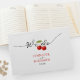 Este bonito livro de hóspedes de chic tem uma adorável, simples design com duas cerejas vermelhas e um roteiro moderno dizendo "Nós temos, todos em um fundo branco." A parte de trás é um código QR branco para direcionar o convidado para o seu site de casamento. Os textos e o código QR são personalizáveis, substitua-os pelo seu! Você pode encontrar produtos correspondentes na nossa Coleção de Casamento de Cereja.