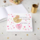 Uma menina bonita chá com um adorável desenho animado de ursinho de pelúcia sentado na lua com um coração cor-de-rosa e um arco e estrelas na cor escura e rosa claro e creme. Grelha e chá de fraldas adorável. Fácil de personalizar substituindo o texto pelo seu.