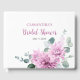 Elegante livro de visitas de chá de noiva floral moderno de meados do verão apresenta um buquê de dália em tons de roxo e rosa, com folhas botânicas verdes exuberantes e eucalipto. Encontre mais designs e variações correspondentes na minha loja "celebrationmoment".