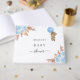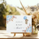 Para um chá de fraldas elegante e moderno. Um fundo branco. Decorado com flores azuis-claras, erva-pampas e um ursinho-peluche segurando um balão azul. Personalize e adicione um nome e data. Spine: adicione seu texto.