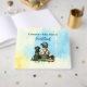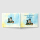 Guestbook de chá de fraldas personalizado. Chá de fraldas de baseball azul e amarelo. Um menino vintage sentado ao lado de um cachorro, um laboratório negro com um boné de beisebol, taco e luva. Fundo azul e amarelo.