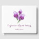 Este livro de hóspedes do chá de panela apresenta lírios de cor d'água roxos. Personalize-o com o nome da noiva no cobrir frontal e na coluna. Este livro convidado faz parte de uma coleção que inclui uma gama de produtos correspondentes. Visite nossa loja para ver o cheio de produtos que você pode personalizar para suas necessidades de celebração de casamento.