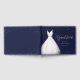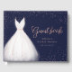 O livro de hóspedes do Elegante chá de panela apresenta o vestido branco de casado com cor d'água com o roteiro de livro de hóspedes glitter rosa de brilho no fundo azul do marinho.