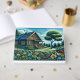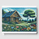 Linoprint de um chalé em colinas pacíficas com primeiro plano de flores coloridas