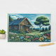 Linoprint de um chalé em colinas pacíficas com primeiro plano de flores coloridas