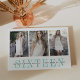 Convide seus 16 festas de aniversário convidados a compartilhar seus desejos e memórias com este livro de hóspedes, com três fotos favoritas alinhadas lado a lado. "Dezesseis" aparece por baixo de uma letra vibrante de turquesa aqua, com uma sobreposição do seu nome e data da festa. Adicione uma foto de sangria de cheio adicional ao cobrir traseiro.