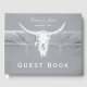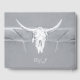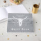 Tema russo cinza branca vaso branco do crânio de vaca no oeste da recepção de cowboy livro de hóspedes. Vintage farm inspirou textura estressada impressa. Antigo estilo de antiguidade ocidental selvagem. design de animais legal, moderno e moderno. Personalize seu script. Imagem copyright Marg Seregelyi Fotografia.