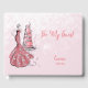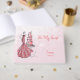 Ilustração à moda à mão de uma mulher de vestido cor-de-rosa com um grande bolo, ambos cobertos de magnólias. O fundo é cor-de-rosa e cinza. As palavras "Parabéns" e o seu nome podem ser facilmente personalizados clicando no botão abc. Ilustrada e projetada por © Janin f.