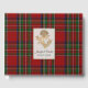 Livro de visitas inspirado em casamento nas Terras Altas feito no clássico padrão xadrez tartã Royal Stewart em vermelho, verde, azul, amarelo, preto e branco. Uma área de texto emoldurada a ouro, na frente do livro, tem gráficos de um cardo dourado e texto personalizado preto pronto para personalizar.