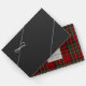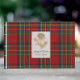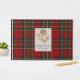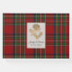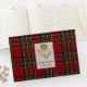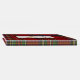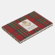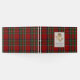 Livro de visitas inspirado em casamento nas Terras Altas feito no clássico padrão xadrez tartã Royal Stewart em vermelho, verde, azul, amarelo, preto e branco. Uma área de texto emoldurada a ouro, na frente do livro, tem gráficos de um cardo dourado e texto personalizado preto pronto para personalizar.