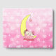 Chá de fraldas de menina rosa doce com um bebê puxado pela mão dormindo pacificamente na lua e nuvens com um fundo de estrelas rosa.