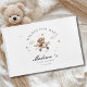Celebre a chegada do seu pequeno com o nosso adorável "Desejos por Bebê! "Livro de convidado do chá de fraldas. Com um encantador ursinho de pelúcia num design de avião vintage, este livro de hóspedes personalizável é a guardiã perfeita para recolher desejos, conselhos e amor sinceros dos vossos hóspedes. Escolha entre 7 opções de cores deliciosas para corresponder ao tema do seu chá — de neutrais suaves a azuis e pinks pastéis. O cobrir frontal e a coluna são totalmente editáveis, permitindo que você personalize o nome, a data e os detalhes especiais. Quer você esteja planejando um chá de fraldas moderno, clássico ou caprichoso, este livro de hóspedes é uma bela e significativa adição à sua celebração. Um eterno para o seu bebê tesourar um dia.