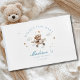Celebre a chegada do seu pequeno com o nosso adorável "Desejos por Bebê! "Livro de convidado do chá de fraldas. Com um encantador ursinho de pelúcia num design de avião vintage, este livro de hóspedes personalizável é a guardiã perfeita para recolher desejos, conselhos e amor sinceros dos vossos hóspedes. Escolha entre 7 opções de cores deliciosas para corresponder ao tema do seu chá — de neutrais suaves a azuis e pinks pastéis. O cobrir frontal e a coluna são totalmente editáveis, permitindo que você personalize o nome, a data e os detalhes especiais. Quer você esteja planejando um chá de fraldas moderno, clássico ou caprichoso, este livro de hóspedes é uma bela e significativa adição à sua celebração. Um eterno para o seu bebê tesourar um dia.