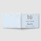 Um fundo azul de bebê na moda com falso brilho prateado, cintilações e número 16 escrito com uma fonte estilo balão. Adicione seu nome, data. Spine: adicione seu texto.