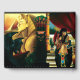 Rainha egípcia com dragão vermelho no ombro. A Rainha está segurando uma esfera de um universo. Um leão negro com asas está em uma montanha com um esfinge atrás.