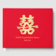 Especialmente desenhado para um casamento chinês, este livro de convidados de casamento apresenta uma bela caligrafia chinesa estilizada em cor dourada de um símbolo chinês tradicional e auspicioso, a "Felicidade Dupla". O termo "Dupla Felicidade" escrito xi ou "hsi" em mandarim e pronunciado "shuang-xi" é um conhecido personagem chinês usado tradicionalmente nos casamentos chineses como símbolo de amor, felicidade e sorte para o recém-casado casal. O uso da cor ouro simboliza uma união brilhante e próspera e a cor vermelha de fundo, que é auspiciosa, assim como uma cor popular na cultura chinesa, simboliza a sorte, a felicidade e a alegria. Um design verdadeiramente ajustado para qualquer celebração de casamento chinesa.