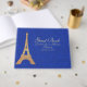 Paris temeu o doce livro convidado de 16 festas feito em azul real sobre padrão azul, com gráficos de uma torre de ouro parecendo Eiffel. Personalize os campos de texto para seu dia especial.