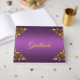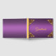 Um convite de casamento muito elegante e sofisticado, apresentando um tema luxuoso de dourado e roxo. Possui uma base roxa metálica deslumbrante na frente e no verso, com ornamentos dourados brilhantes em cada canto na frente do livro. O texto na frente pode ser personalizado conforme necessário (ou, claro, deixado como está). Este álbum de convidados chique também seria muito adequado para uma variedade de eventos e celebrações.