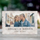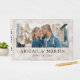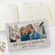 O livro de convidados elegante e romântico personalizado na frente e atrás com fotos noivados do casal feliz. A frente e a coluna são impressas com os nomes e a data do casamento.