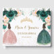 Prepare seu dia especial para os anos virem com um livro de hóspedes. Apresentando uma garota marmelada no vestido verde esmeralda e outra garota margarida de vestido rosa pincelado, verde esmeralda bonito e flores cor-de-rosa pinceladas e borboletas esmeraldas e rosa. Personalize-o com seus detalhes de forma fácil e rápida, basta pressionar o botão personalizar para reorganizar e formatar o estilo e a colocação do texto. c) O Feliz Cat Studio
