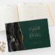 Este elegante livro de hóspedes do casamento apresenta uma design de agata preta, aparada com falsa brilho dourado. Personalize facilmente o texto dourado em um fundo esmeraldo, com os nomes dos casais na caligrafia caprichosa sobre uma grande e grande escala. Adicione texto adicional da sua escolha à frente e à coluna.