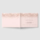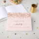 Um guia para uma festa de formatura feminina e glamourosa. Um fundo cor-de-rosa pincelado com rosa dourado confetti. O texto: O nome é escrito com um moderno estilo escrito à mão com traços. Com o texto: Formando - classe de 20xx (ou qualquer ano). Adicione seu texto na coluna. Para manter as hastes, exclua apenas o nome da amostra, deixe os espaços ou emoji na frente e depois do nome.