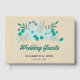 Este livro de convidados de casamento apresenta um gráfico floral desenhado à mão que oferece as cores: azul, tons de chel, cinza e verde. A cor de fundo é o khaki tan, embora possa ser alterada para qualquer cor disponível escolhendo personalizá-la. O texto personalizado permite adicionar os nomes da noiva e do noivo e a data do casamento.