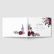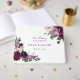 Flores de aquarela em tons de lilás rico, gentil, berinjela profundo, corpúsculo e rosado com botânicos verdes modernos, como samambaias e eucalipto, nesses livros de casamento românticos e elegantes de boho.