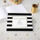 Este elegante, ousado e moderno livro de convidados, listrado, preto e branco, apresenta uma camada branca, limitada com folha de ouro falso rosa, o texto é escrito em uma fonte sans serif bonita e elegante, e o nome do casal é impresso em uma letra de texto tendenciosa, escrita à mão. A parte de trás do livro apresenta as mesmas faixas horizontais em negrito e branco que figuram na frente, e a coluna é branca com os nomes da noiva e do noivo, e a data do casamento, impressa em texto vertical. Este é um design de modelo, e todos os campos de texto podem ser editados, e este produto é apresentado numa Coleção de produtos correspondentes no meu compro de designers.