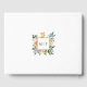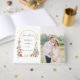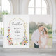 Borda graciosa de arco de ouro com rolhas elegantes embelezadas com flores silvestres pastel de cor bóvica romântica a azul pálido, rosa e amarela. Inclui campos de texto, modelo de foto e monograma no verso. Esta coleção encantadora é o complemento perfeito para o seu casamento com Primavera, Verão ou jardim.
