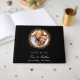 Um fundo preto na moda com brilho azul rosa-ouro brilha ao redor da foto. Adicione seus nomes, data de casamento, uma foto. Coloque seu próprio texto.