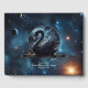 Galáctica Grace: O Cisne Negro. O cisne exalta graça e dignidade enquanto flutua suavemente na superfície lisa de uma piscina de água. A água não só reflete a beleza do cisne, como também revela sua reflexão mesmerizadora, misturando-se harmoniosamente com os arredores. A design transmite uma sensação de calma e grandiosidade enquanto celebra a beleza da natureza e do universo.