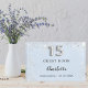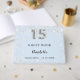 Um fundo azul de bebê na moda com falso brilho prateado, cintilações e número 15 escrito com uma fonte estilo balão. Adicione seu nome, data. Spine: adicione seu texto.
