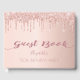 Um livro de hóspedes para uma cinzenta e glamourosa festa de aniversário. Um fundo rosa de ouro falso com um brilho elegante rosa de ouro brilhante, pintura pingada. O texto: O nome e o título: Guest Book (Livro de Convidados) são escritos em ouro rosa escuro com um moderno estilo escrito à mão. Tempate para uma data e 50 anos.