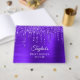 Crie seu próprio livro de convidados do 16° aniversário do Sweet 16 party (ou qualquer marco de um ano). A brilho brilhante da violeta brilha por cima de uma fina e brilhante folha violeta violeta violeta e uma folha de metal brilhante tipo metal escovado por índio elétrico. Personalize o estilo clássico da letra da caligrafia elegante para criar seu próprio livro convidado sua celebração especial. O design é criado por um trabalho de arte digital que impressão como uma foto.