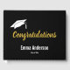 Este livro de hóspedes preto, branco e de graduação dourado tem um boné branco no canto superior esquerdo. O texto de exibição diz 'Parabéns no script dourado faux (não folha). Você pode personalizar o livro convidado com o nome do formando em texto branco. Você pode até adicionar o ano de classe com o nome. Há também texto para o nome do formando e ano de aula na coluna. Todo o texto pode ser editado ou excluído.