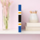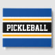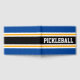 Este design esportivo apresenta texto PICKLEBALL atlético dentro de uma faixa horizontal de corridas em preto largo com faixas brancas e amarelas brilhantes ouros contra faixas azuis de borda externa em negrito. As cores e o texto neste design podem ser personalizados.